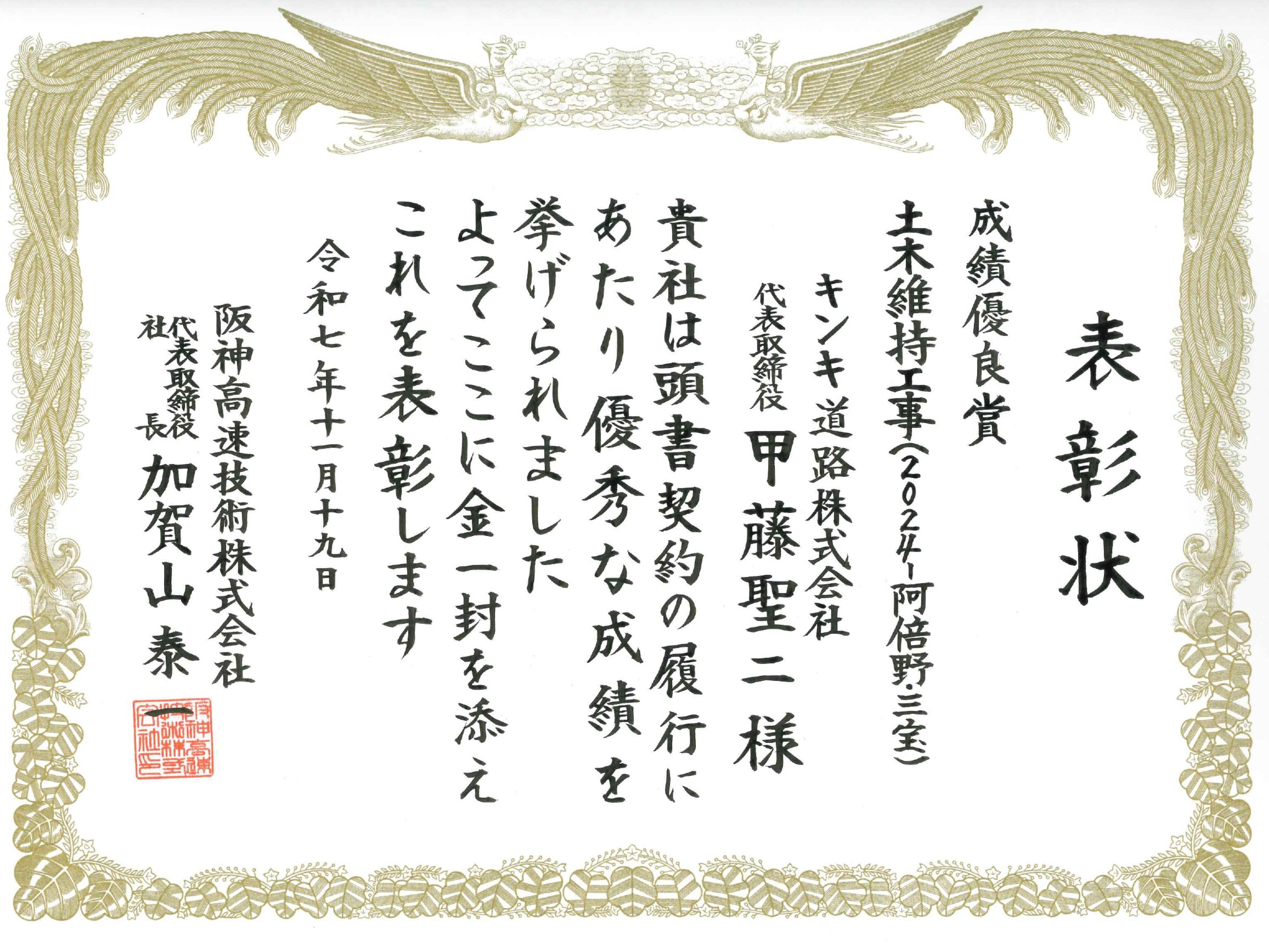 阪神高速道路株式会社様より優秀受注者として表彰して頂きました。